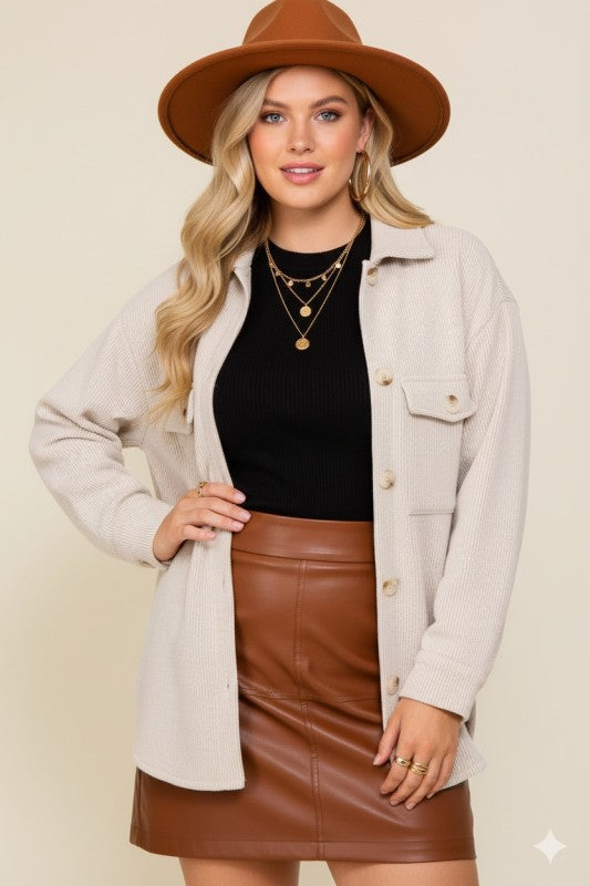 PLUS SIZE-Stylish and cozy ensemble! A long-sleeved, button-down brushed waffle shaket that exudes warmth and sophistication. A front double pocket casual jacket, perfect for on-the-go outings, completes the look. Don't this masterpiece and embrace effortless fashion.